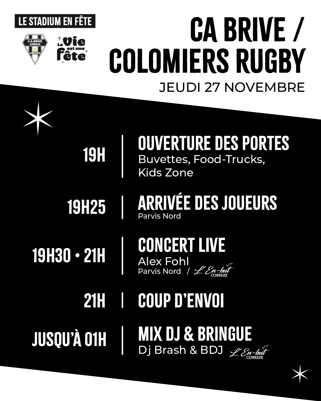 Pour cette nouvelle rencontre à domicile, le CA Brive et la Vie est une Fête s'associent pour faire du Stadium un lieu de vie incontournable. Plus qu'un simple match de rugby, le parvis va devenir un véritable lieu de fête pour tous les supporters Noir et Blanc. Un programme festif et musical à vivre dès l'ouverture des portes, avant, pendant et après le match.