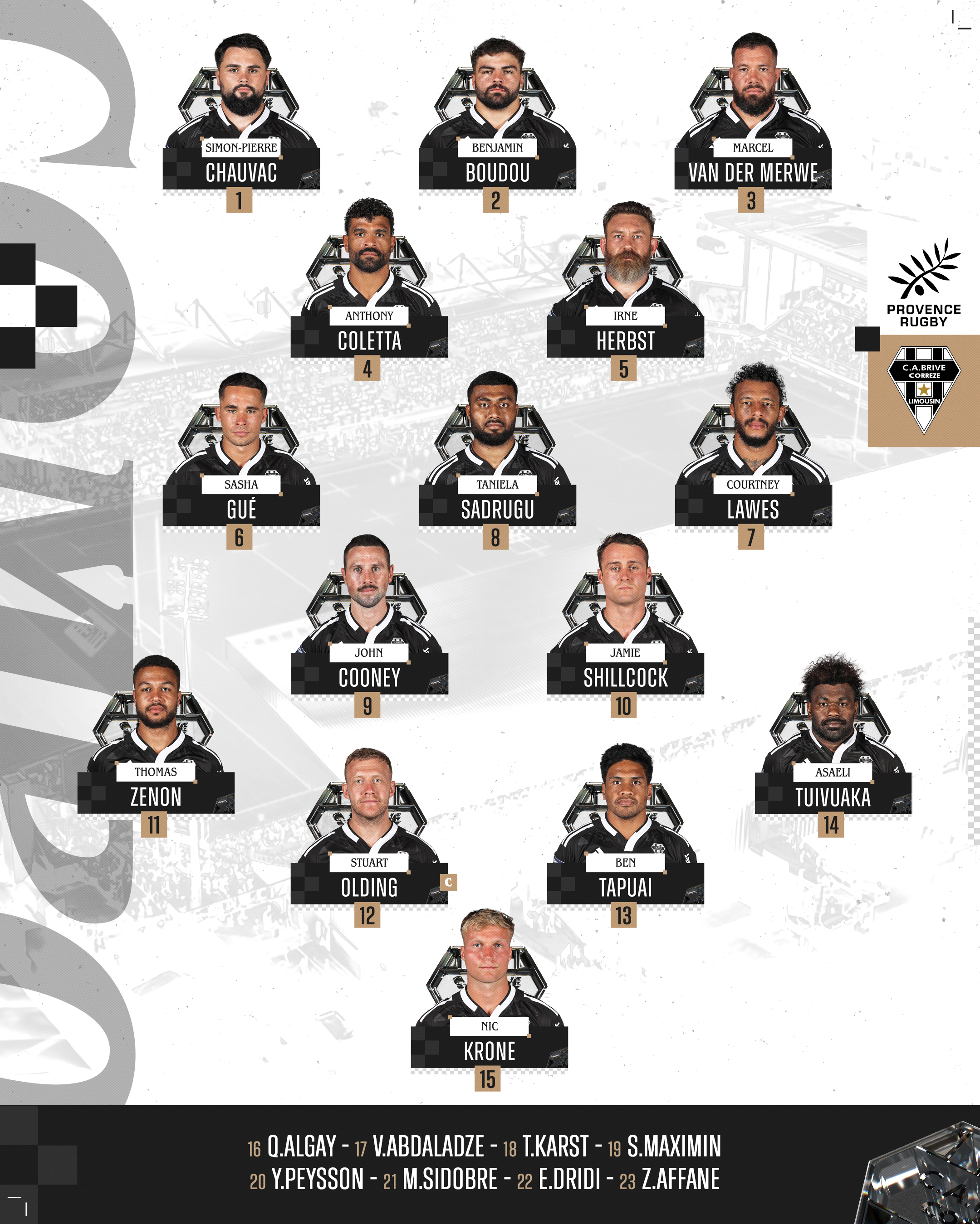 Pour le compte de la neuvième journée de Pro D2, les Brivistes vont connaître leur quatrième déplacement de la saison, face à Provence Rugby. Sur la pelouse synthétique du stade Maurice-David, le staff a choisit d'aligner des joueurs mobiles et d'expérience. Voici les 23 Noir & Blanc qui seront de la partie pour aller glaner un deuxième succès loin de la Corrèze.