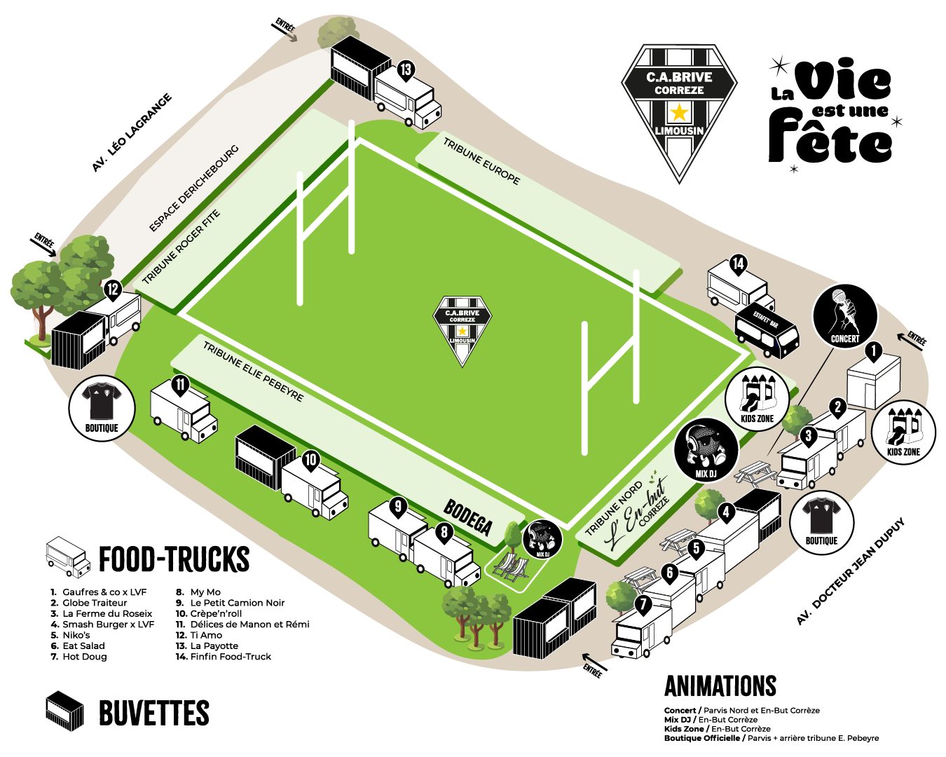 Pour cette nouvelle rencontre à domicile, le CA Brive et la Vie est une Fête s'associent pour faire du Stadium un lieu de vie incontournable. Plus qu'un simple match de rugby, le parvis va devenir un véritable lieu de fête pour tous les supporters Noir et Blanc. Un programme festif et musical à vivre dès l'ouverture des portes, avant, pendant et après le match.